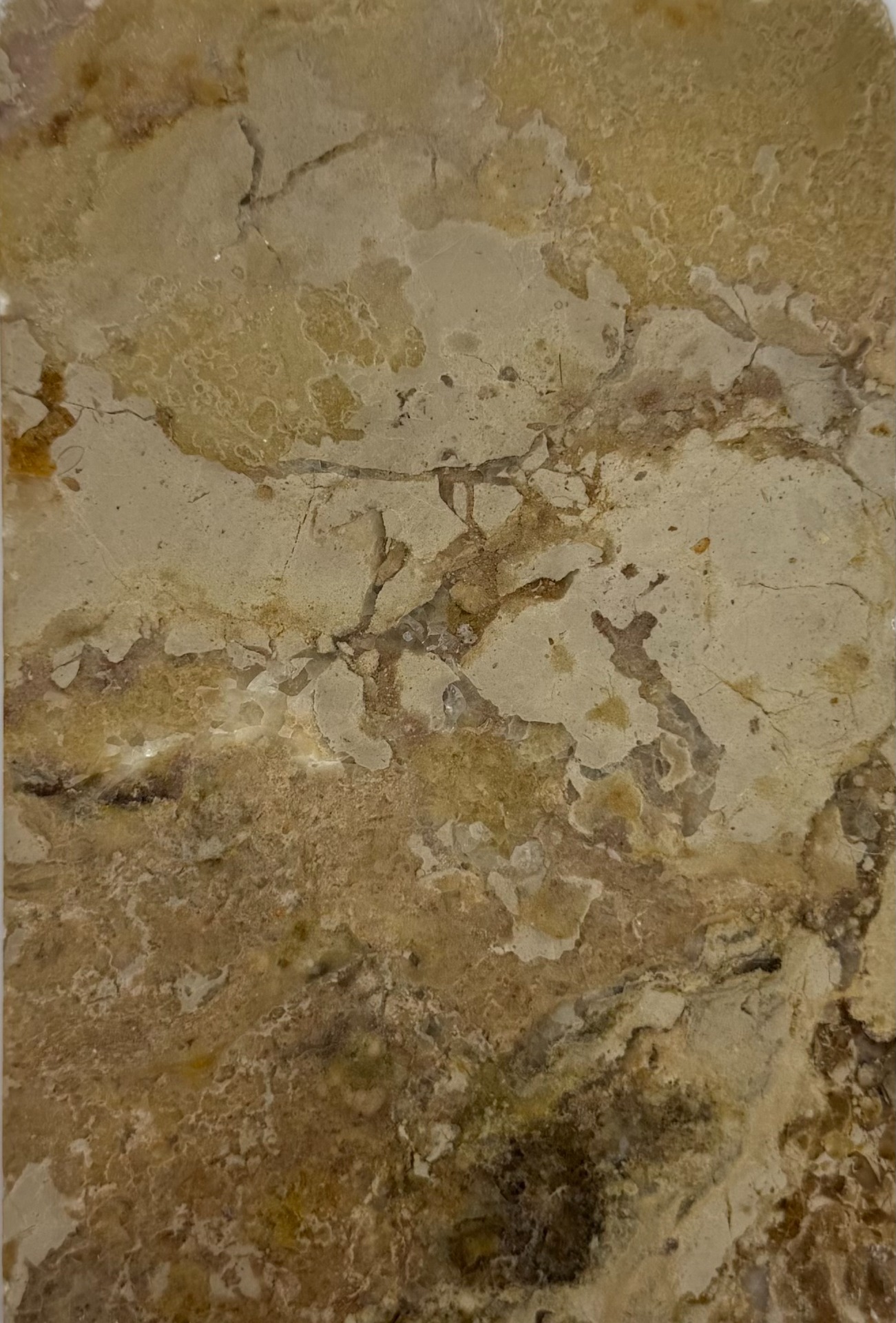 Den kännetecknas av sin distinkta utseende med fragment av olika färger, vanligtvis vita, beige, röda eller bruna, sammanfogade i en matris.