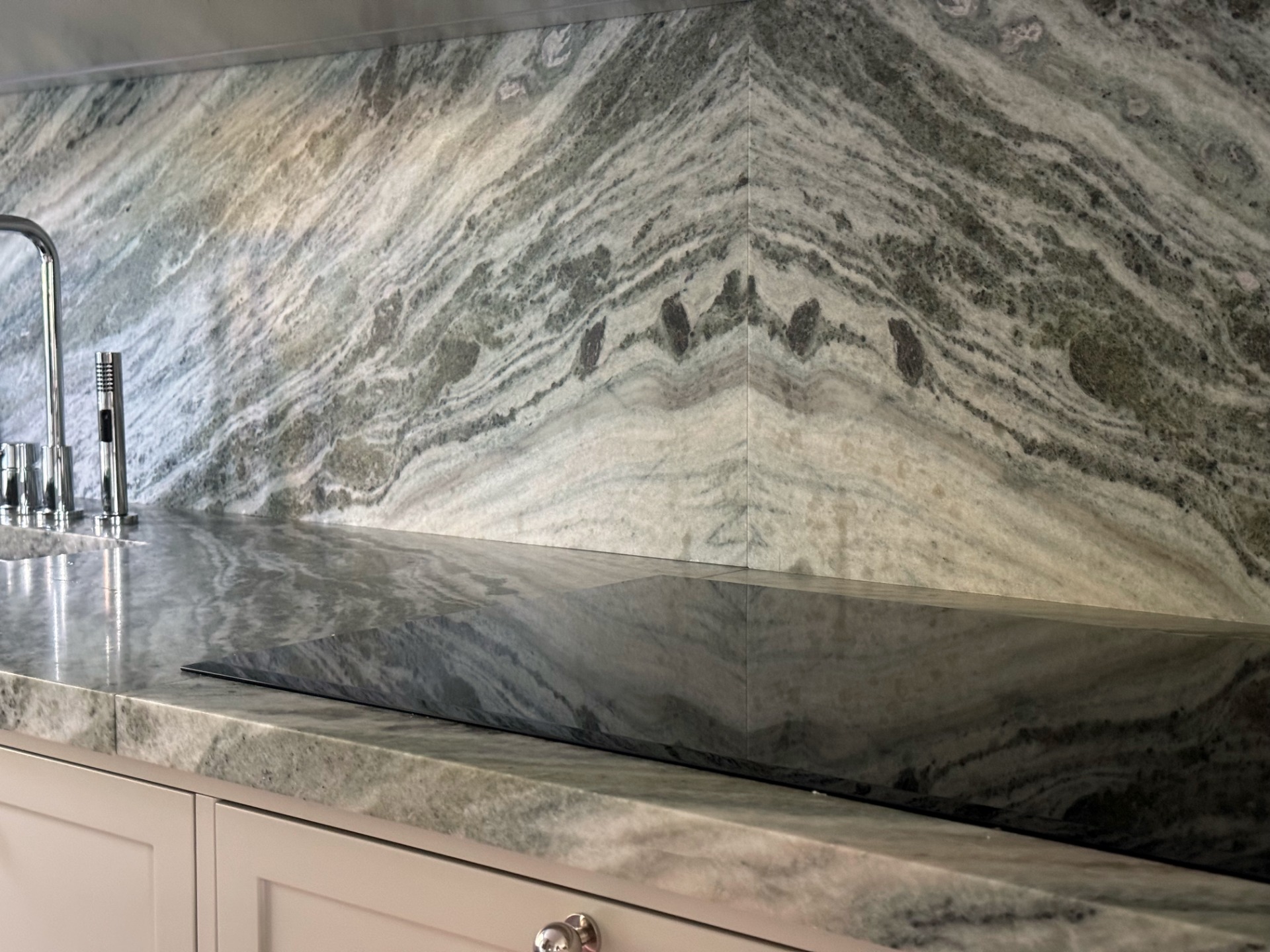 Genom att använda fler skivor från samma stenblock kan man spegla ådringen från bänkskivan upp på väggen. Book-matching passar också väldigt bra när man vill täcka en större yta än stenblocket tillåter.